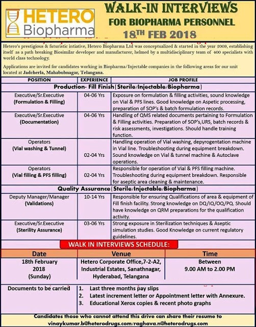 WALK-IN INTERVIEWS FOR BIOPHARMA PERSONNEL