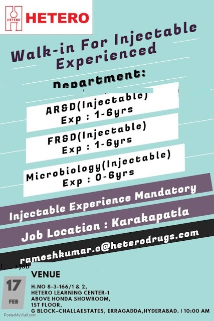 WALK-IN INTERVIEWS FOR HETRO LABS. LTD