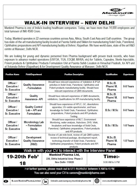 WALK-IN INTERVIEW – AT NEW DELHI IN MANKIND PHARMA